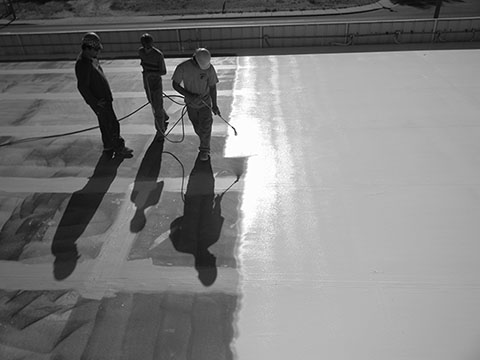 First, all coatings begin as a liquid. Some are applied with a spray gun, while others are hand-rolled into place. This liquid is applied over your existing system and covers your entire roofing structure. That includes flashings, around protrusions and even partially up the parapet walls.